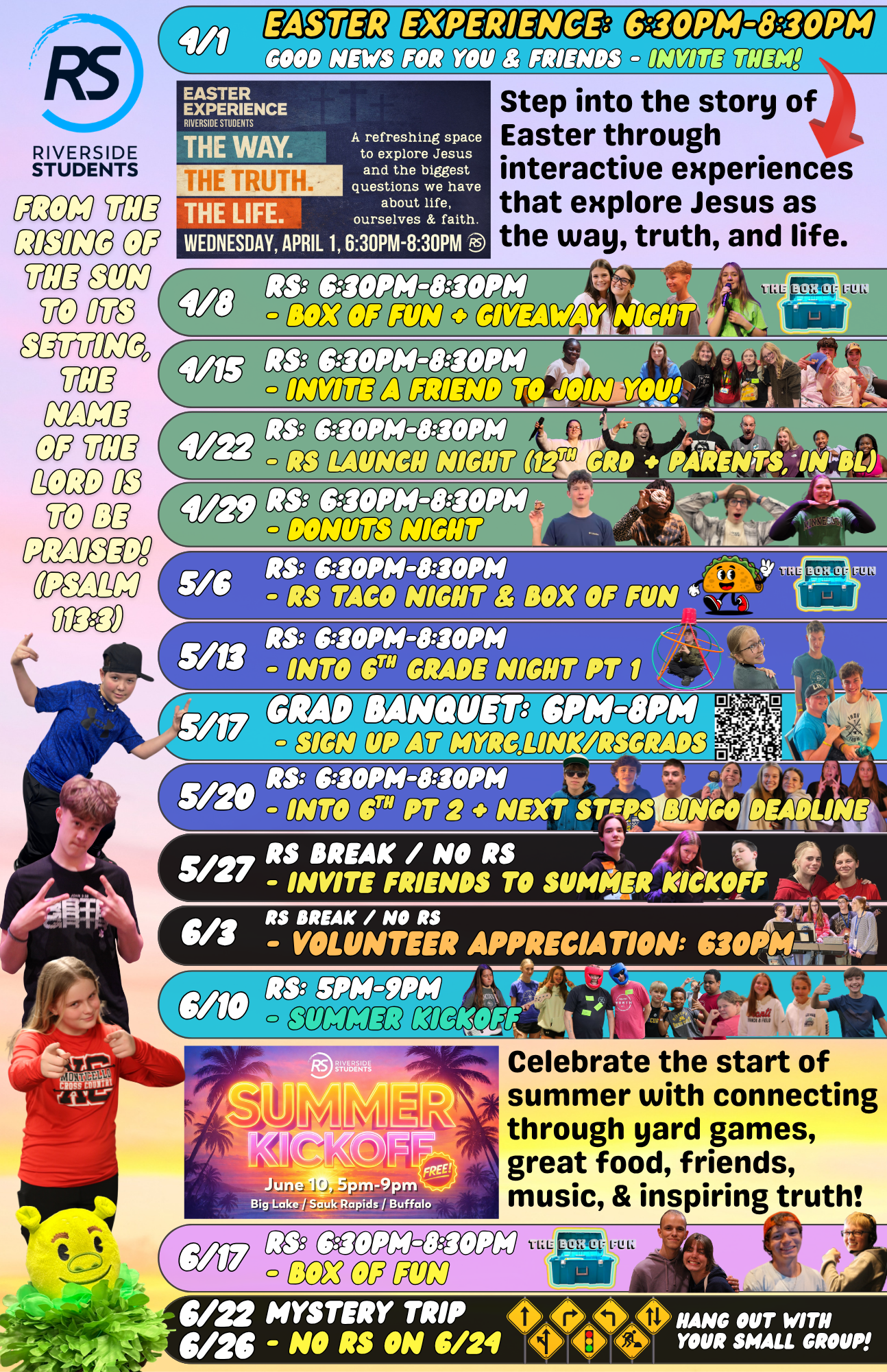 Riverside Students (RS) is all about reaching students (and everyone in their lives) to help them become fully-devoted followers of Jesus.