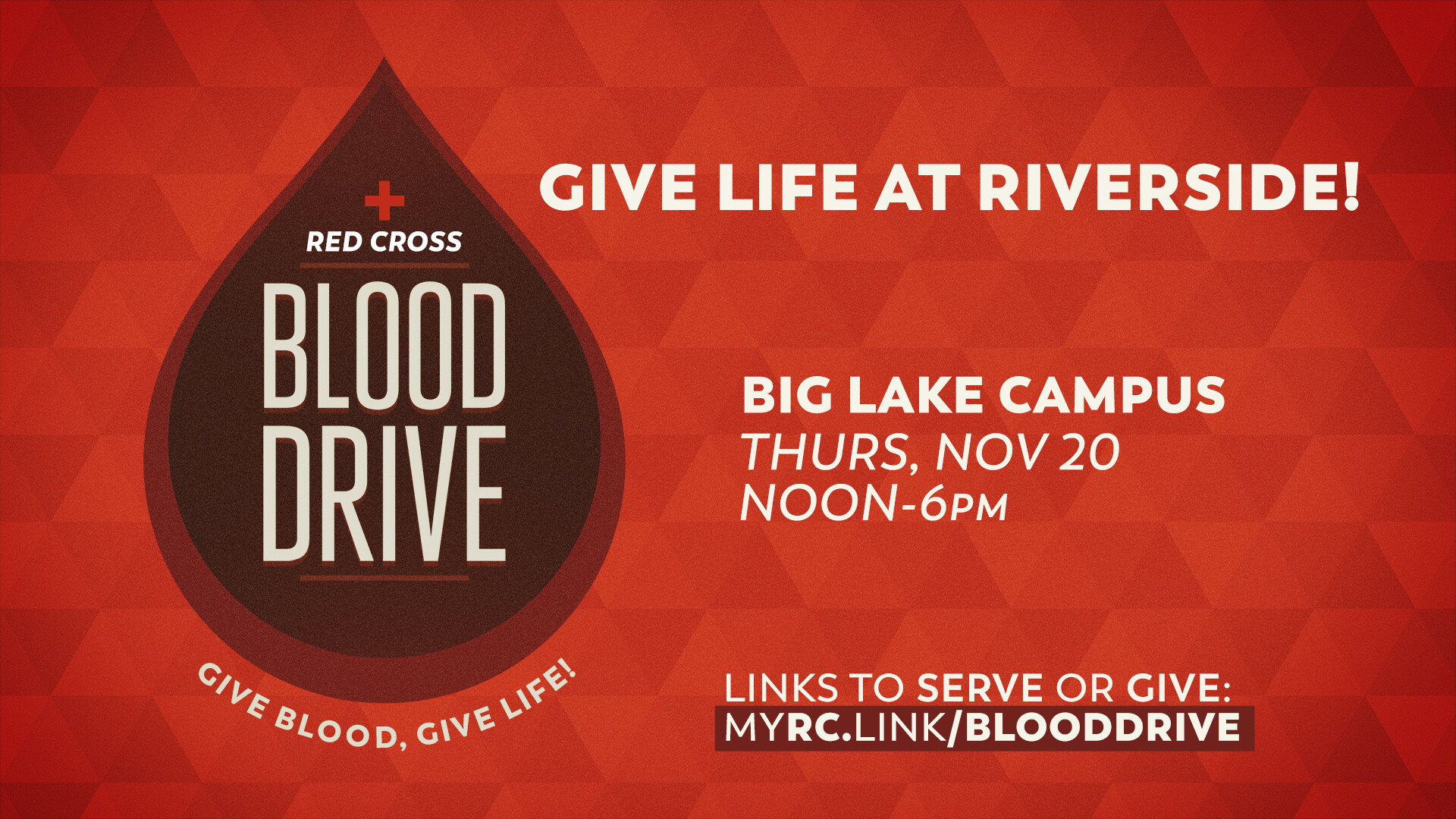 GIVE BLOOD, GIVE LIFE! Thurs, Nov 20, 12-6pm, Big Lake Campus. Help meet a critical need in our community. Looking for volunteers to greet guests too. Opportunities to give & to serve!