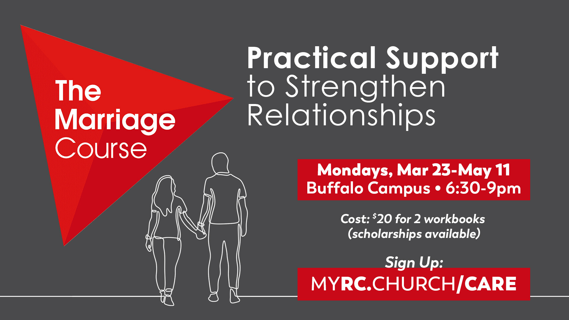 To help couples invest in their relationship and build a strong home life. Cost: $20/couple (scholarships available). Click image to register. Hosted at Buffalo Campus, Mondays, Mar 23-May 11, 6:30-9pm.