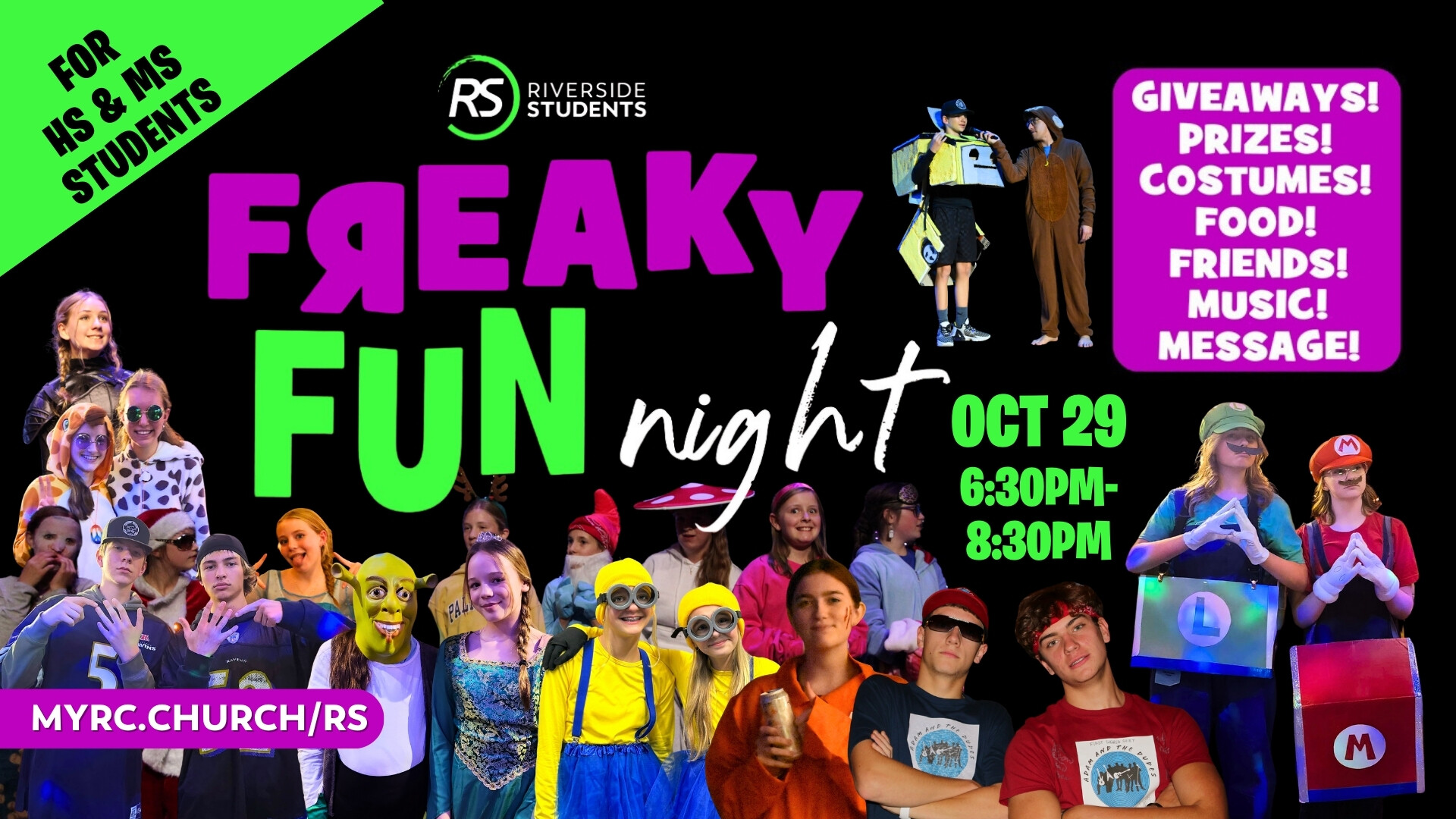 We're throwing a party this month for YOU and ALL YOUR FRIENDS!!! It's FREAKY FUN NIGHT, happening Wednesday, 10/29 from 630pm-830pm. Fun costumes encouraged, especially for the costume party! Lots of fun food, great music and a message of hope as well. It's the perfect way to enjoy the season, so join in!