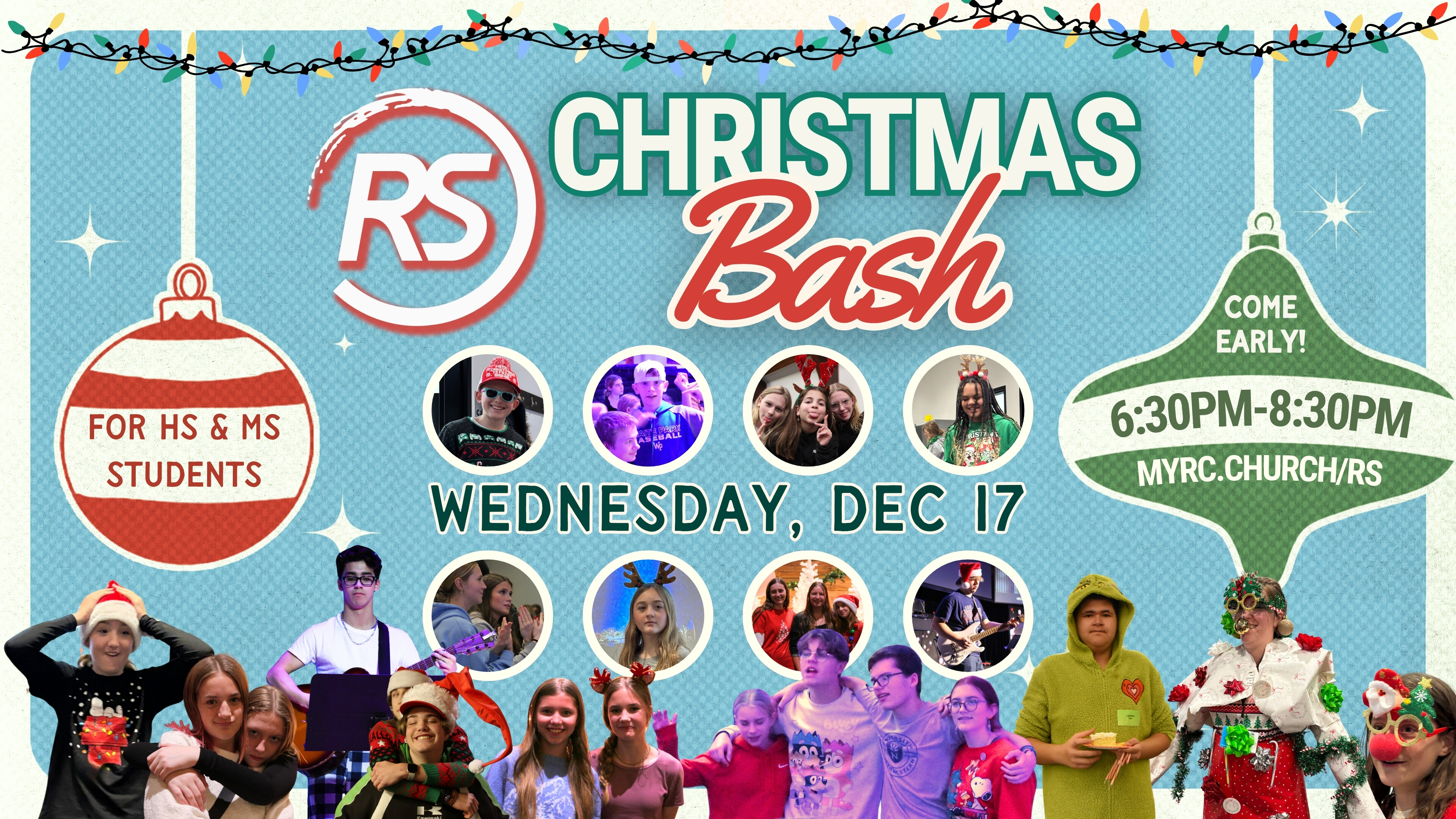 Fun event for Riverside students, grades 6-12 at both campuses. Join us Wednesday, December 17 @ 6:30pm-8:30pm for our annual Christmas Bash! Come for yummy food, fun games, and more! Invite your friends! Invite your friends!