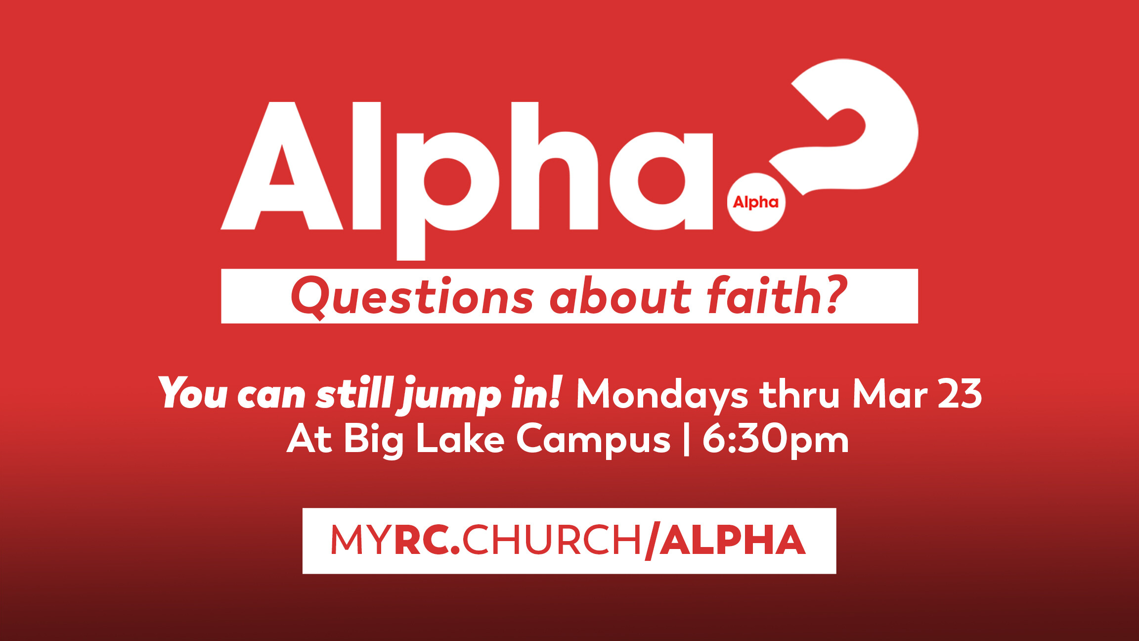 Connect with others, learn about an element of faith, and ask questions & share perspectives. (Light meal served, too!) Mondays, through Mar 23, 6:30pm - Big Lake Campus. Click image to register.